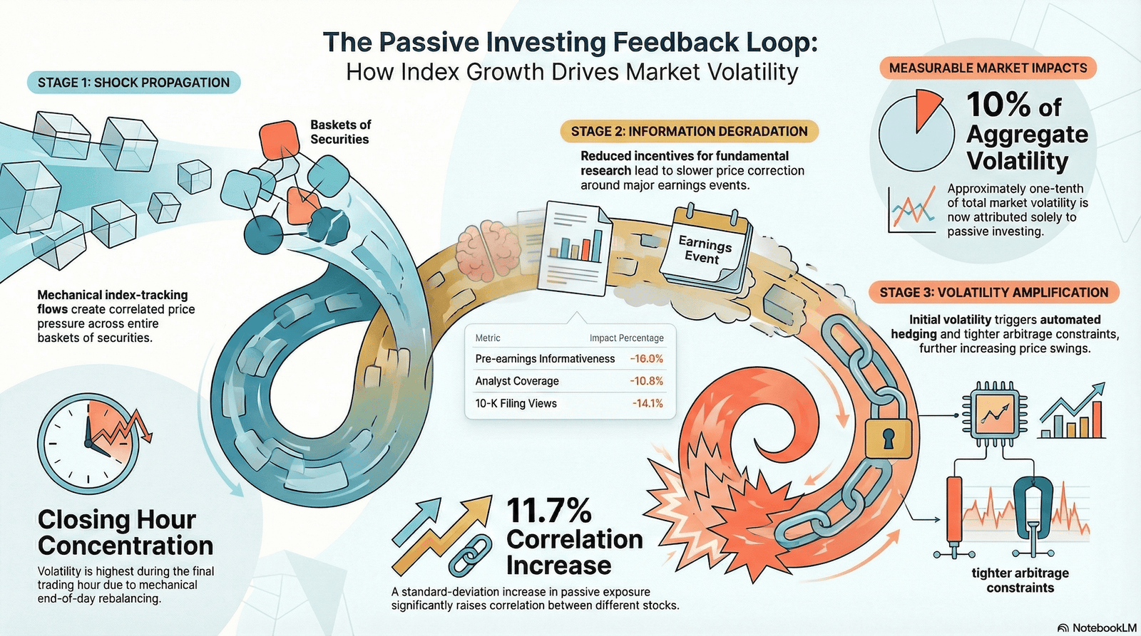 Stage 3: Amplification Through Volatility Feedback. Elevated volatility created by mechanical flows produces second-round effects. Volatility-targeting strategies, leveraged ETFs, and dynamic hedging algorithms respond to volatility spikes by rebalancing portfolios. These mechanical responses add to existing order imbalances, generating further volatility. Additionally, higher volatility increases the capital requirement for arbitrageurs (collateral, margin haircuts), tightening their funding constraints and reducing their ability to absorb additional price pressure from passive flows. The system exhibits a feedback property: initial passive flow → price pressure → volatility spike → mechanical reactions → amplified volatility → tighter arbitrage constraints → reduced correction of mispricings.